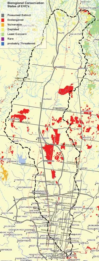It is notable that all of the Ecological Vegetation Classes[53] (EVCs) listed for the Victorian Volcanic Plain Bioregion within the Merri Catchment meet the criteria set down in the Native Vegetation Plan for the highest priority protection (see Table 6)